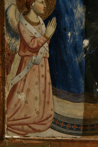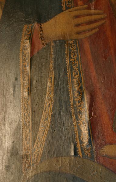 contraction gesso, losses gesso, flaking paint layer and gilding, numerous overpaintings, darkenedvarnish.
