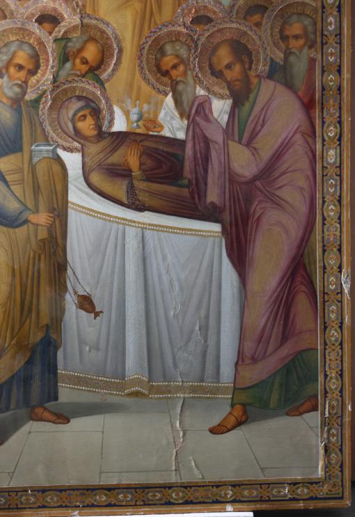gilding on gesso, many losses of gesso, flaking, contraction of
