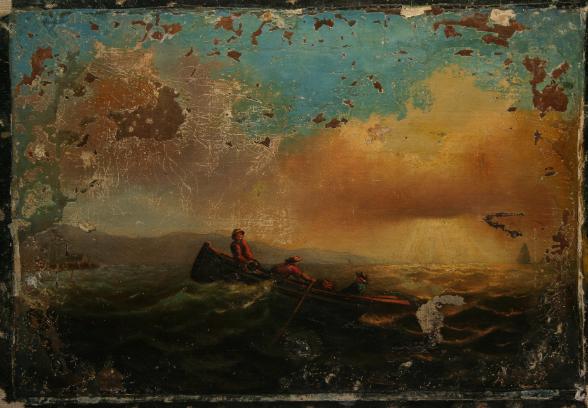 AMERICAN SEA SCAPE ARTIST UNKNOWN CONDITION: PAINTING GOT TO ART CONSERVATION LABORATORY AFTER ATTEMPT BY SOMEBODY TO RESTORE IT. POOR RELINING, GESSO SMEARED MORE THAN OVER MISSING AREAS,